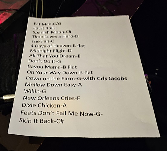| Setlist: Fat Man In The Bathtub, Let It Roll, Spanish Moon, Time Loves a Hero, The Fan, 4 Days of Heaven, Midnight Flight, All That You Dream, Don`t Do It, Bayou Mama, On Your Way Down, Down on the Farm*, Mellow Down Easy, Willin, New Orleans Cries, Dixie Chicken, Feats Don`t Fail Me Now, E: Skin It Back | |