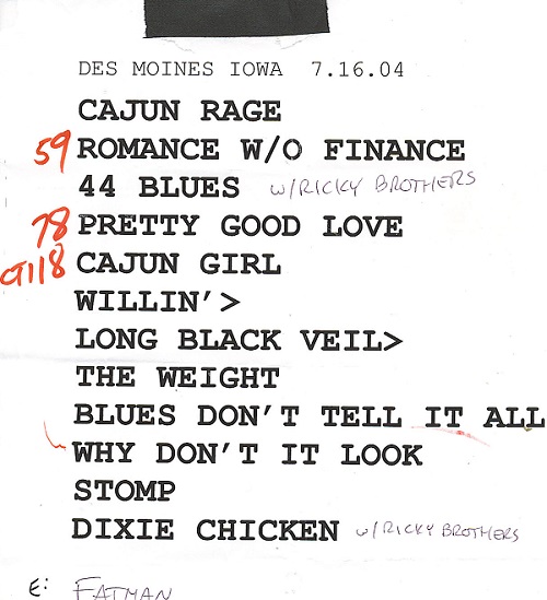 | Setlist: Cajun Rage, Romance Without Finance, Forty-Four Blues* > Pretty Good Love, Cajun Girl, Willin' > Long Black Veil > The Weight > Willin', The Blues Don't Tell It All, Why Don't It Look Like The Way That It Talk, Stomp, Dixie Chicken* > Bass solo > Harp jam* > Key solo > Gringo > Corazones y Sombras > Tennessee Jed* > Dixie Chicken* Encore: Fat Man In The Bathtub > Get Up Stand Up > Fat Man In The Bathtub | |