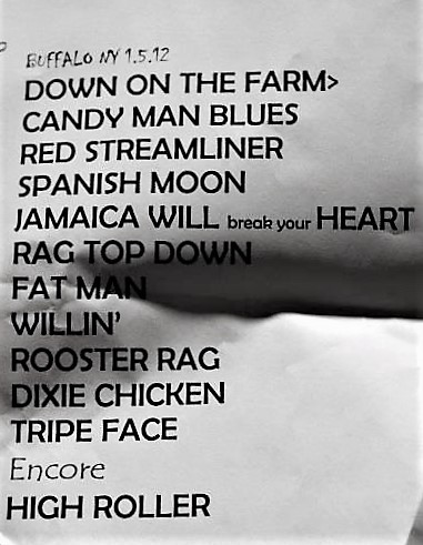 | Setlist: Down On The Farm > Candy Man Blues, Red Streamliner, Spanish Moon, Jamaica Will Break Your Heart, Rag Top Down, Fat Man In The Bathtub > Abba Zaba > Boogie On Reggae Woman > Fat Man In The Bathtub, Willin` > Don`t Bogart Tht Joint > Willin`, Rooster Rag, Dixie Chicken > Bass jam > key/drum jam > Dixie Chicken > Tripe Face Boogie, E: High Roller | |