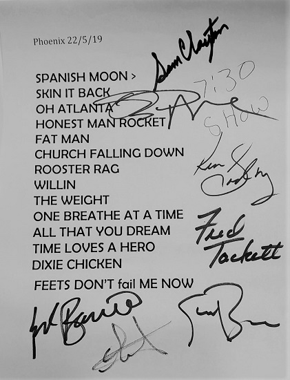 | Setlist: Rocket In My Pocket, Spanish Moon > Skin It Back, Oh Atlanta, Honest Man, Fat Man In The Bathtub, Church Falling Down, Rooster Rag, Willin`, The Weight, One Breathe At A Time, All That You Dream, Time Loves A Hero, Dixie Chicken, E: Feats Don`t Fail Me Now | |