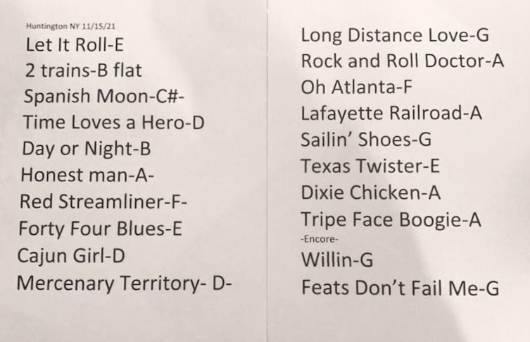 | Setlist: Let It Roll, Two Trains, Spanish Moon, Time Loves A Hero, Day Or Night, Honest Man, Representing The Mambo, Forty Four Blues, Cajun Girl, Mercenary Territory, Long Distance Love, Rock and Roll Doctor, Oh Atlanta, Lafayette Railroad, Sailing Shoes, Texas Twister, Dixie Chicken > Day At The Dog Races Jam > Tripe Face Boogie, E: Willin`* (with Jack Broadbent), Feats Don`t Fail Me Now | |