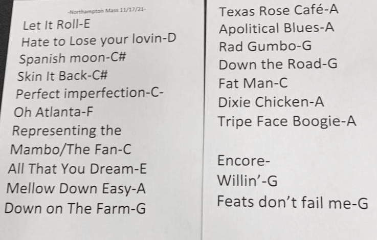 | Setlist: Let It Roll, Hate To Lose Your Lovin’, Spanish Moon, Skin It Back, Perfect Imperfection, Oh Atlanta, Representing The Mambo > The Fan, All That You Dream, Mellow Down Easy, Down On The Farm, Texas Rose Café, A Apolitical Blues, Rad Gumbo, Down The Road, Fat Man In The Bathtub, Dixie Chicken, Tripe Face Boogie, E: Willin` *(with Jack Broadbent), Feats Don’t Fail Me Now | |