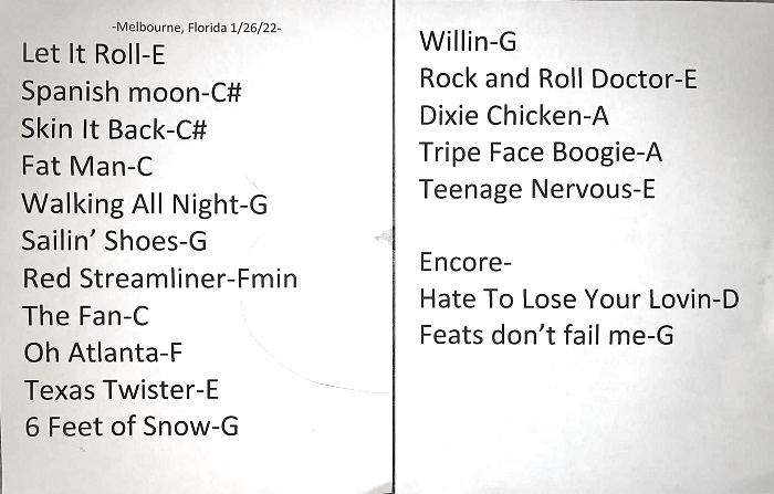 | Setlist: LET IT ROLL, SPANISH MOON > SKIN IT BACK, FAT MAN IN THE BATHTUB, WALKING ALL NIGHT, SAILIN` SHOES, RED STREAMLINER, THE FAN, OH ATLANTA, TEXAS TWISTER, SIX FEET OF SNOW, WILLIN`, ROCK AND ROLL DOCTOR, DIXIE CHICKEN > TRIPE FACE BOOGIE, TEENAGE NERVOUS BREAKDOWN, E: HATE TO LOSE YOUR LOVIN`, FEATS DON`T FAIL ME NOW, | |