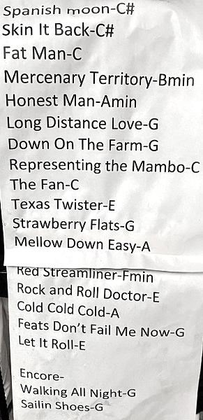 | Setlist: Spanish Moon > Skin It Back, Fat Man In The Bathtub, Mercenary Territory, Honest Man, Long Distance Love, Down On The Farm, Representing The Mambo, The Fan, Texas Twister, Strawberry Flats, Mellow Down Easy, Red Streamliner, Rock And Roll Doctor, Cold Cold Cold, Feats Don`t Fail Me Now, Let It Roll E: Walkin` All Night, Sailin` Shoes | |