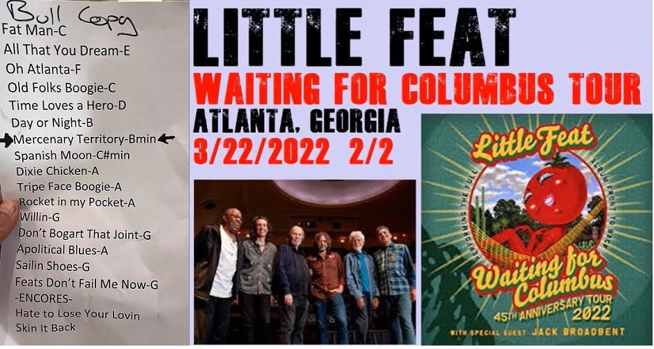 | Setlist: Fat Man In The Bathtub, All That You Dream, Oh Atlanta, Old Folks Boogie, Time Loves A Hero > Day Or Night, Mercenary Territory, Spanish Moon, Dixie Chicken > Tripe Face Boogie, Rocket In My Pocket, Willin` > Don`t Bogart That Joint, A Apolitical Blues > Long Distance Call, Sailin` Shoes, Feats Don`t Fail Me Now, E: Hate To Lose Your Lovin, Skin It Back | |