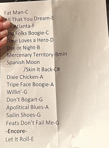 | Setlist: Fat Man In The Bathtub, All That You Dream, Oh Atlanta, Old Folks Boogie, Time Loves A Hero > Day Or Night, Spanish Moon > Skin It Back, Dixie Chicken > Tripe Face Boogie, Rocket In My Pocket, Willin`> Don`t Bogart That Joint, A Apolitical Blues, Sailin` Shoes, Feats Don`t Fail Me Now, E: Let It Roll | |