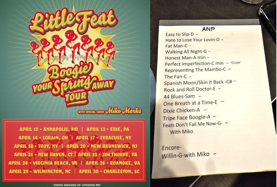 | Setlist: Easy To Slip, Hate To Lose Your Lovin, Fat Man In The Bathtub, Walkin All Night, Honest Man, Perfect Imperfection, Representing The Mambo, The Fan, Spanish Moon > Skin It Back, Rock And Roll Doctor, 44 Blues, One Breath At A Time, Dixie Chicken > Tripe Face Boogie, Feats Don`t Fail Me Now*, E: Willin* | |