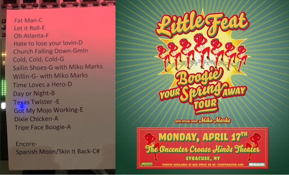 | Setlist: Fat Man In The Bathtub, Let It Roll,Oh Atlanta, Hate To Lose Your Lovin, Church Falling Down, Cold Cold Cold, Sailin Shoes*, Willin*, Time Loves A Hero > Day Or Night, Texas Twister, Got My Mojo Working, Dixie Chicken > Tripe Face Boogie, E: Spanish Moon > Skin It Back | |