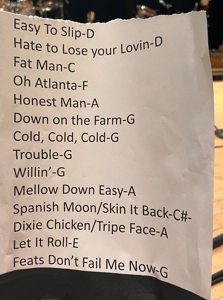 | Setlist: Easy To Slip, Hate To Lose Your Lovin`, Fat Man In The Bathtub, Oh Atlanta, Honest Man, One Clear Moment, Down On The Farm, Cold Cold Cold, Trouble, Willin`, Mellow Down Easy, Spanish Moon > Skin It Back, Dixie Chicken > Tripe Face Boogie, Let It Roll, Feats Don`t Fail Me Now, E:Two Trains, Cajun Girl, Time Loves A Hero | |