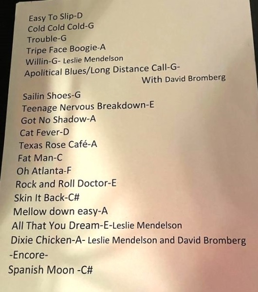 | Setlist: Easy To Slip, Cold Cold Cold, Trouble, Tripe Face Boogie, Willin`, Apolitical Blues > Long Distance Call*, Sailin` Shoes, Teenage Nervous Breakdown, Got No Shadow, Cat Fever, Texas Rose Cafe, Fat Man In The Bathtub, Oh Atlanta, Rock And Roll Doctor, Skin It Back, Mellow Down Easy, All That You Dream, Dixie Chicken*, E: Spanish Moon | |