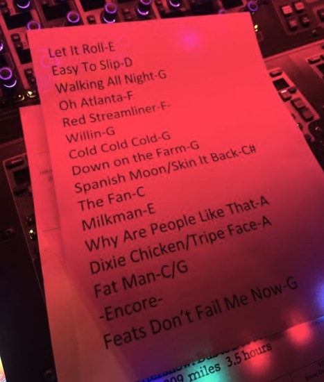| Setlist: Let It Roll, Milkman, Easy To Slip, Walking All Night, Oh Atlanta, Red Streamliner, Willin`, Cold Cold Cold, Down On The Farm, Spanish Moon > Skin It Back, The Fan, Milkman, Why Are People Lke That, Dixie Chicken > Tripe Face Boogie, Fat Man In The Bathtub, E: Feats Don`t Fail Me Now Dixie Chicken > Tripe Face Boogie, E: Feats Don`t Fail Me Now | |