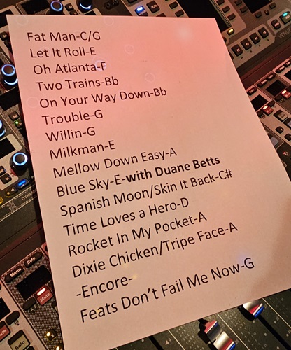 | Setlist: Fat Man In The Bathtub, Let It Roll, Oh Atlanta, Two Trains, On Your Way Down, Trouble, Willin`, Milkman, Mellow Down Easy, Blue Sky*, Spanish Moon > Skin It Back, Time Loves A Hero , Rocket In My Pocket, Dixie Chicken > Tripe Face Boogie, E: Feats Don`t Fail Me Now, E2: Hate To Lose Your Lovin` | |