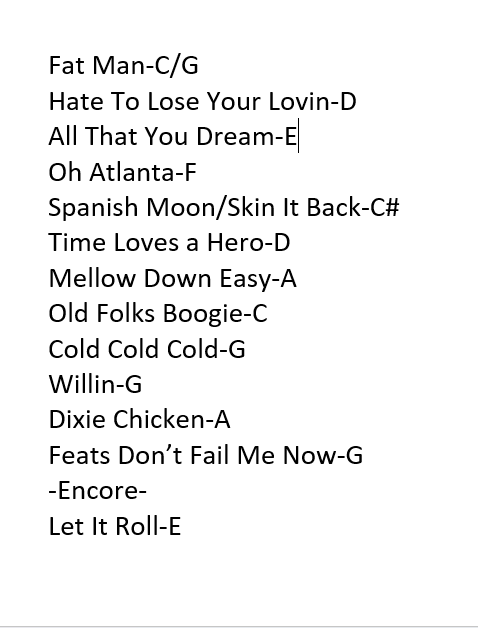 | Setlist: Fat Man In The Bathtub, Hate To Lose Your Lovin, All That You Dream, Oh Atlanta, Spanish Moon > Skin It Back, Time Loves a Hero, Mellow Down Easy, Old Folks Boogie, Cold Cold Cold, Willin, Dixie Chicken, Feats Don’t Fail Me Now, E: Let It Roll | |