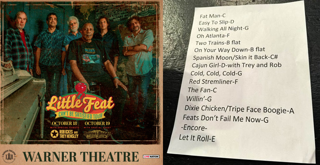 | Setlist: Fat Man In The Bathtub, Easy To Slip, Walking All Night, Oh Atlanta, Two Trains, On Your Way Down, Spanish Moon > Skin It Back, Cajun Girl*, Cold Cold Cold, Red Streamliner, The Fan, Willin, Dixie Chicken > Tripe Face Boogie, Feats Don`t Fail Me Now, E: Let It Roll | |