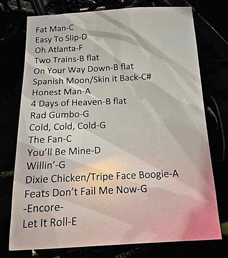 | Setlist: Fat Man In The Bathtub, Easy To Slip, Oh Atlanta, Two Trains, On Your Way Down, Spanish Moon > Skin It Back, Honest Man, 4 Days Of Heaven, Rad Gumbo, Cold Cold Cold, The Fan, You`ll Be Mine, Willin`, Dixie Chicken > Tripe Face Boogie, Feats Don`t Fail Me Now, E: Let It Roll | |